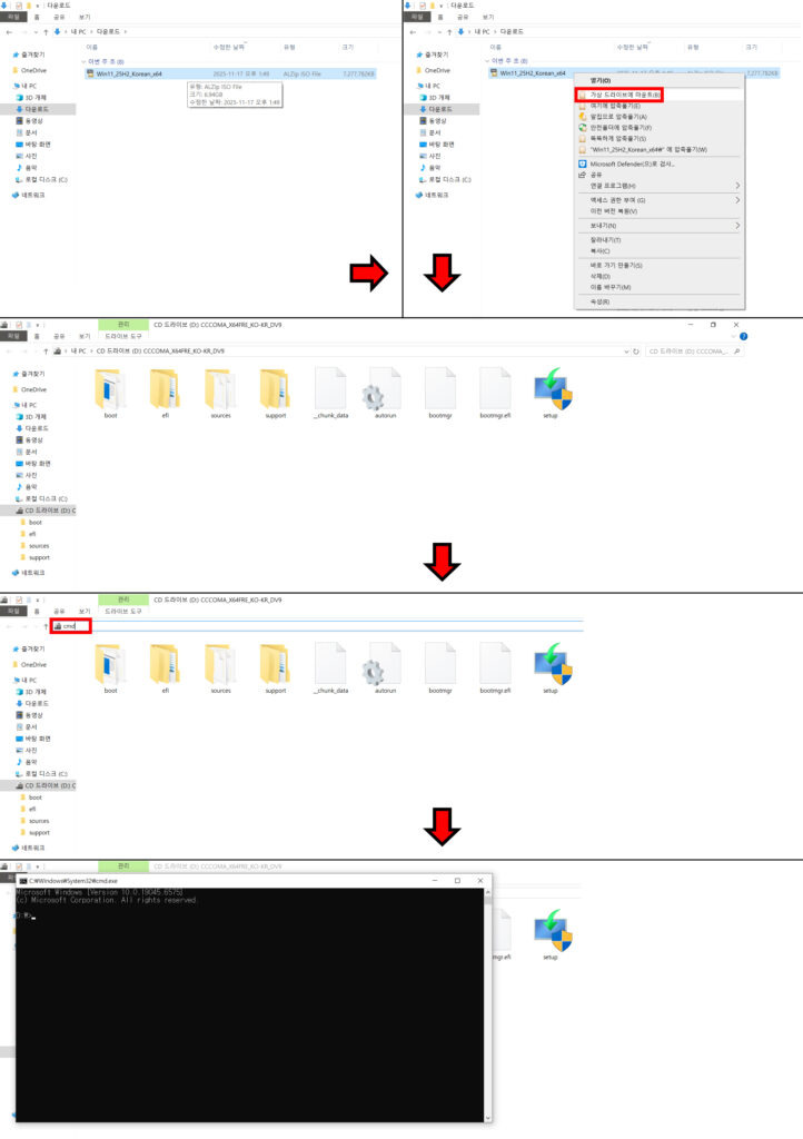 3. 다운 받은 윈도우11 이미지(ISO) 파일을 가상드라이브에 마운트해준뒤 윈도우11 이미지(ISO) 파일에 탐색기로 들어가 위에 경로 창에 cmd(명령 프롬프트)를 입력해 실행해줍니다.